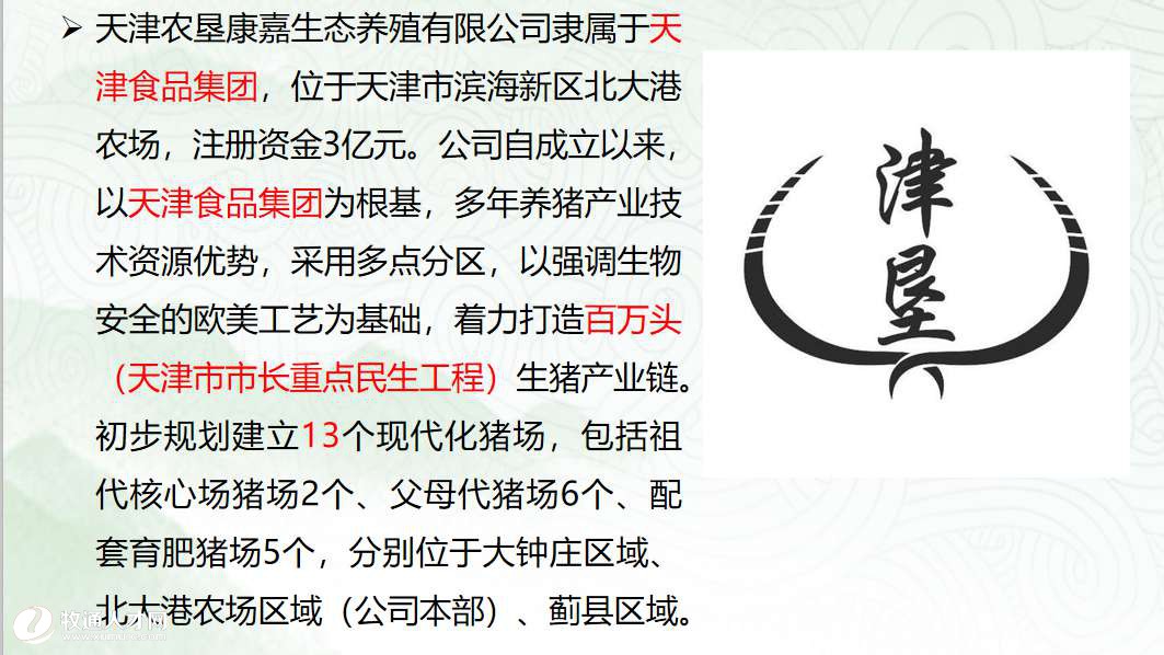 天津農墾康嘉生態(tài)養(yǎng)殖有限公司位于天津市濱海新區(qū)北大港農場,注冊資金3億元,專注于生豬的綠色養(yǎng)殖事業(yè),以天津食品集團為導向,天津食品集團是天津市重點發(fā)展的食品產業(yè)集團,以食品產業(yè)為核心,打造綠色發(fā)展產業(yè)鏈,推動生豬、肉羊、蛋雞、奶牛牧場等規(guī)?;こ探ㄔO,向城市保障供應米面油、肉蛋奶、調料等11大類3000多中放心食品,產品面向全國市場。生豬產業(yè)技術資源優(yōu)勢,采用多點分區(qū),以強調生物安全的歐美工藝為基礎,著力打造百萬頭(天津市市長重點民生工程)生豬產業(yè)鏈。3年規(guī)劃建立13個現代化豬場,包括祖代核心場豬場2個、父母代豬場6個、配套育肥豬場5個,分別位于大鐘莊區(qū)域、北大港農場區(qū)域(公司本部)、薊縣區(qū)域。
