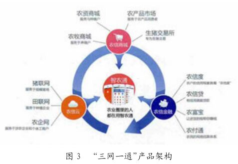 智慧大北農(nóng)是運(yùn)用移動(dòng)互聯(lián)網(wǎng)、物聯(lián)網(wǎng)等先進(jìn)思想與技術(shù),將公司、員工、事業(yè)伙伴、同行融合在一張巨大的“網(wǎng)”上,通過智能化、網(wǎng)絡(luò)化、終端化的手段顛覆公司、客戶及行業(yè)的傳統(tǒng)管理、營運(yùn)及商業(yè)模式,推動(dòng)大北農(nóng)業(yè)務(wù)線上線下高度融合,建立基于農(nóng)村的人、信息和商務(wù)三者協(xié)同發(fā)展的PIB新模式,將大北農(nóng)打造成為一個(gè)高科技、互聯(lián)網(wǎng)化和類金融的現(xiàn)代農(nóng)業(yè)創(chuàng)業(yè)服務(wù)平臺。以數(shù)據(jù)管理為內(nèi)容為主的農(nóng)信云、以商品交易為主的農(nóng)信商城、以金融服務(wù)為主的農(nóng)信金融,外加上把以手機(jī)聯(lián)通三者業(yè)務(wù)的智農(nóng)通,構(gòu)成“三網(wǎng)一通”產(chǎn)品架構(gòu),如圖3。