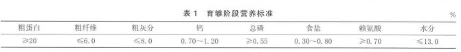 3.1 育雛階段(1-40日齡)。育雛階段營養(yǎng)標(biāo)準(zhǔn)見表1。