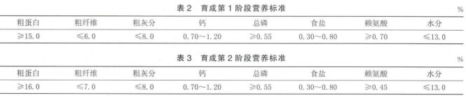 育成又分2個(gè)階段段,第1階段為40-90日齡,其營養(yǎng)標(biāo)準(zhǔn)見表2。第2階段為90-120日齡,其營養(yǎng)標(biāo)準(zhǔn)見表3。