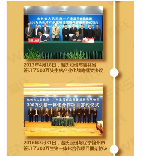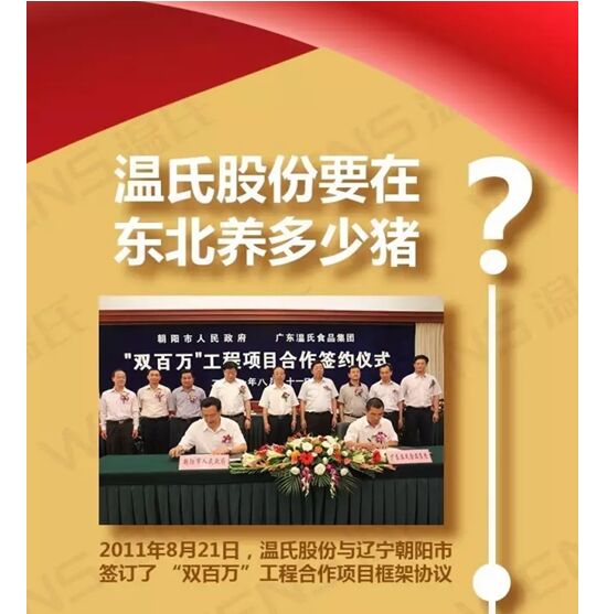 2011年8月21日,溫氏股份與遼寧朝陽市政府簽訂了 “雙百萬”工程合作項(xiàng)目框架協(xié)議,提出年出欄生豬300萬頭的目標(biāo),從此,溫氏股份奏響進(jìn)軍東北的號(hào)角。2013年4月18日,溫氏股份與吉林省簽訂了500萬頭生豬產(chǎn)業(yè)化戰(zhàn)略框架協(xié)議,加上錦州市300萬頭生豬一體化合作項(xiàng)目順利簽約,溫氏股份在東北的生豬戰(zhàn)略布局已達(dá)1100萬頭。