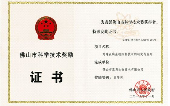 近日,佛山市正典生物技術(shù)有限公司“雞球蟲病生物防制技術(shù)的研究與應(yīng)用”項(xiàng)目榮獲佛山市科學(xué)技術(shù)一等獎(jiǎng)。
