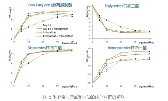 從圖1的豬油和豆油的體外水解試驗(yàn)結(jié)果我們可以看出:豆油的水解效率要顯著高于豬油的水解效率(游離脂肪酸、甘油一酯和甘油二酯的水平越高說(shuō)明油脂的水解效率越高,同理當(dāng)甘油三酯的水平越低說(shuō)明油脂的水解效率越高)。