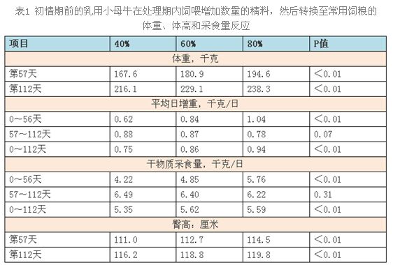 在該研究中,增加谷物的配入量從飼糧干物質(zhì)的40%至80%,導(dǎo)致小母牛體重的增加(表1)。