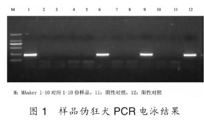 應(yīng)用北京世紀(jì)元亨動物防疫技術(shù)有限公司偽狂犬病毒PCR檢測試劑盒,對采集的病料進(jìn)行病原學(xué)檢測,結(jié)果見圖1。