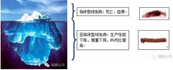 球蟲病的通常發(fā)生情況,我們只可以看到冰山的一角,就是出現臨床型球蟲病時,導致的損傷和死亡,但隱藏在水面以下的冰山主體部分,可以撕裂船體,造成巨大的危害(亞臨床型球蟲病,常常被忽視,往往帶來更大的經濟損失)。