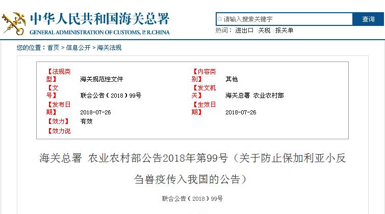 鑒于保加利亞近日首次出現(xiàn)小反芻獸疫疫情,為保護(hù)我國畜牧業(yè)安全,防止疫情傳入,海關(guān)總署與農(nóng)業(yè)農(nóng)村部聯(lián)合發(fā)布《關(guān)于防止保加利亞小反芻獸疫傳入我國的公告》(2018年第99號)。公告要求各地海關(guān)、各級動(dòng)物疫病預(yù)防控制機(jī)構(gòu)及動(dòng)物衛(wèi)生監(jiān)督機(jī)構(gòu)要分別按照《中華人民共和國進(jìn)出境動(dòng)植物檢疫法》和《中華人民共和國動(dòng)物防疫法》的有關(guān)規(guī)定,密切配合,做好檢疫、防疫和監(jiān)督工作。