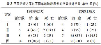 (3)不同治療方案對(duì)不同年齡階段犬瘟熱的治療效果見表3。