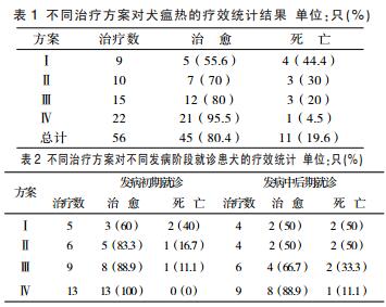 (2)不同治療方案對(duì)不同發(fā)病階段就診的犬瘟熱患犬的治療效果見表2。