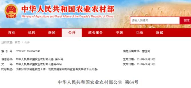 根據(jù)《中華人民共和國動物防疫法》《重大動物疫情應(yīng)急條例》等法律法規(guī)規(guī)定,為做好非洲豬瘟疫情防控工作,現(xiàn)就加強豬用飼料監(jiān)管工作有關(guān)事項公告如下。
