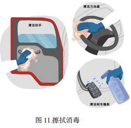 用清水、洗滌液對方向盤、儀表盤、踏板、檔桿、車窗搖柄、手扣部位等進行擦拭(圖11)。對駕駛室進行熏蒸消毒或用過氧乙酸氣溶膠噴霧消毒。