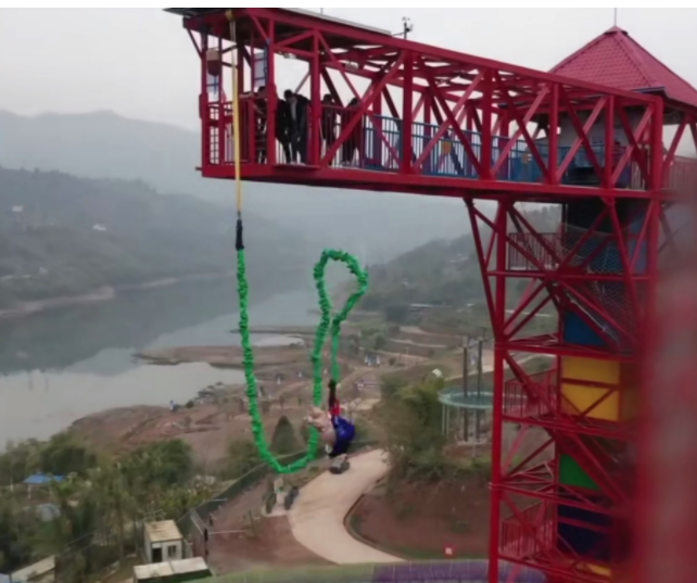 現(xiàn)場視頻顯示,幾名工作人員將一頭肥豬綁好安全繩、做完防護措施后,便將豬推下蹦極臺。系著安全繩索的肥豬在空中蕩來蕩去,蹦極臺下方是水面。