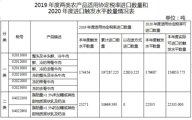 根據(jù)《中華人民共和國政府和澳大利亞政府自由貿易協(xié)定》和海關總署公告2019年第207號,我國對自澳大利亞進口的兩類8個稅號農產品(以下簡稱兩類農產品)實施特殊保障管理措施?,F(xiàn)將2019年度兩類農產品適用協(xié)定稅率進口數(shù)量和2020年度進口觸發(fā)水平數(shù)量予以公布。