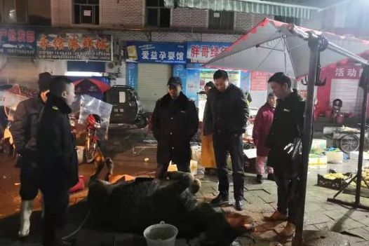凌晨5點左右,寒風凜冽,執(zhí)法人員蹲守近兩個小時后,發(fā)現(xiàn)市場內(nèi)有4人將一頭活牛電殺后,在牛的胸口處割開一道口子,并將水管插入其中,進行“灌水”。