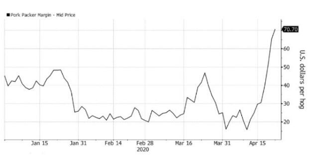 這種生豬——豬肉價(jià)格差使得仍然能夠運(yùn)轉(zhuǎn)的肉類加工廠賺的盆滿缽滿。一些工廠正在農(nóng)戶從購買低廉的生豬,加工轉(zhuǎn)手賣給超市,賺取高額的溢價(jià)。自4月1日以來,豬肉利潤率已躍升340%。