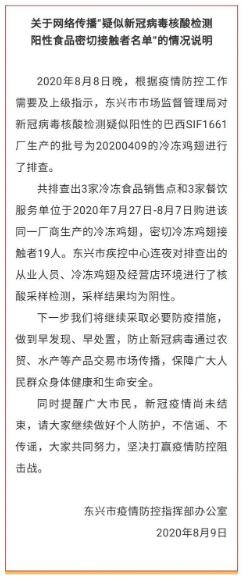 8月7日,廣東湛江(代管吳川)官方通報(bào),經(jīng)省疾控中心復(fù)核,進(jìn)口凍雞翅樣本核酸檢測(cè)結(jié)果為陰性。
