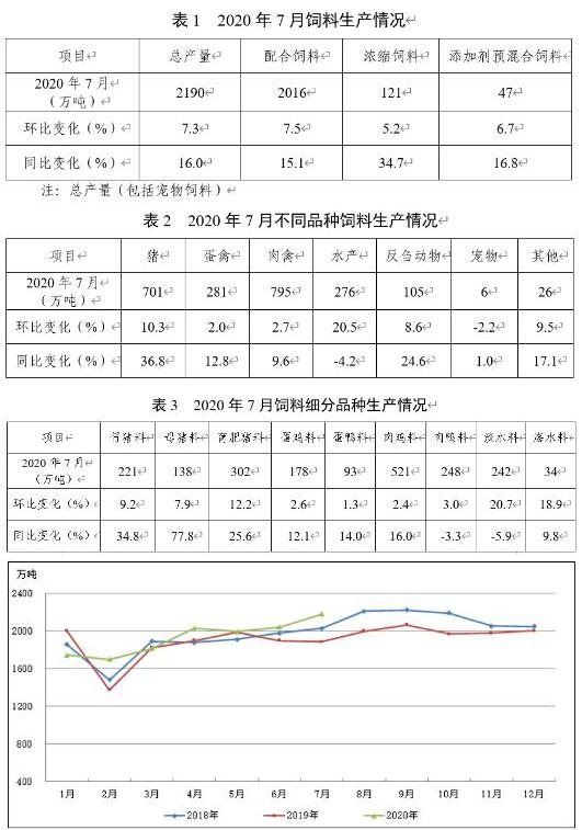據(jù)截至8月6日已填報(bào)企業(yè)測(cè)算,2020年7月,飼料總產(chǎn)量2190萬(wàn)噸,環(huán)比增長(zhǎng)7.3%,同比增長(zhǎng)16.0%。從趨勢(shì)上看,今年3月、4月和6月、7月飼料總產(chǎn)量環(huán)比增長(zhǎng),7月環(huán)比較上月擴(kuò)大5.1個(gè)百分點(diǎn);2月以后,除3月份同比小幅下降外,其余各月份產(chǎn)量均比上年同期有所增長(zhǎng),7月飼料產(chǎn)量達(dá)近三年的高位水平,高于2017年以來(lái)的月度平均產(chǎn)量。