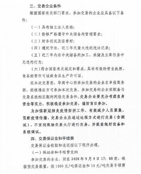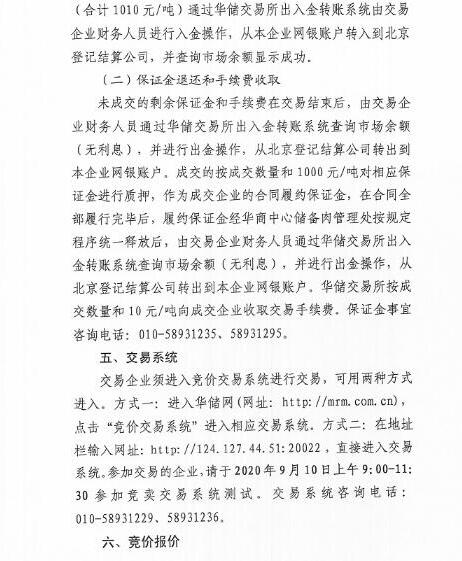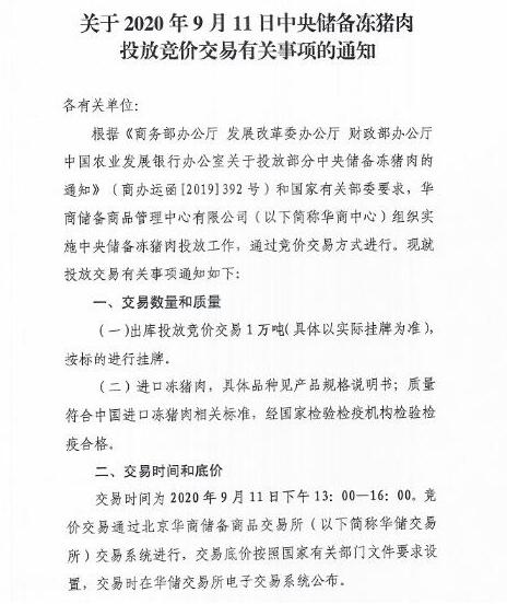 華儲網(wǎng)發(fā)布2020年9月11日中央儲備凍豬肉投放競價交易有關事項的通知,將競價交易1萬噸。