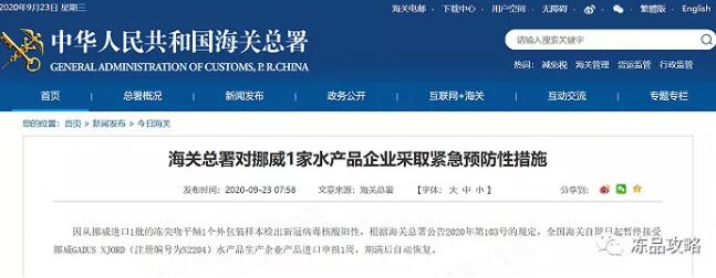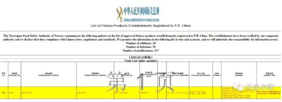 同時,9月23日,海關(guān)發(fā)布的挪威食品安全局向中華人民共和國注冊的經(jīng)批準(zhǔn)的漁業(yè)產(chǎn)品機(jī)構(gòu)更新表格也顯示:自2020年9月23日起暫停接受廠名為GADUS NJORD的出口企業(yè)產(chǎn)品進(jìn)口申報1周。