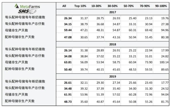 該報(bào)告由美國養(yǎng)豬數(shù)據(jù)公司MetaFarms及子公司SMS具體制作,所用數(shù)據(jù)為其系統(tǒng)中至少建檔3年以上的美國豬場的數(shù)據(jù),2019年該數(shù)據(jù)集涵蓋母豬場600個(gè),母豬1,588,246頭,保育豬15,666,136頭,育肥豬17,479,763頭,斷奶到育肥豬8,023,610頭。