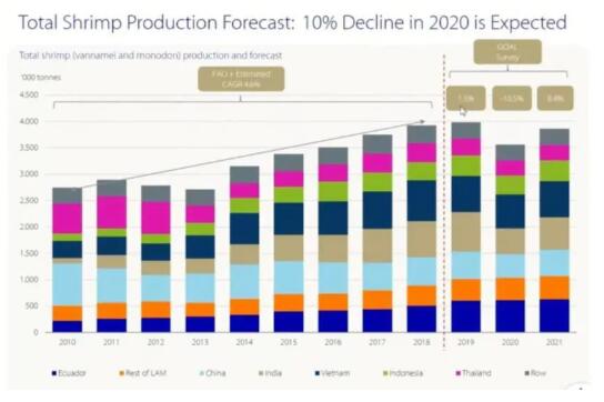 自2012年以來,印度就南美白對蝦產(chǎn)量的增長一直在飛速發(fā)展,但似乎在2019年達(dá)到頂峰,同比增長17.6%。GAA的受訪者預(yù)計(jì),2020年將下降26.5%,至600,000噸以下,而2021年將僅增長4.3%。“這是COVID嚴(yán)格的封鎖,缺乏種子,加工商或多或少在一段時(shí)間內(nèi)無法出口導(dǎo)致的?!?nbsp;