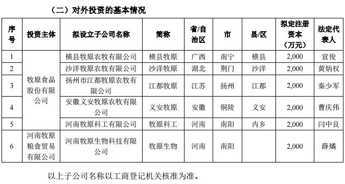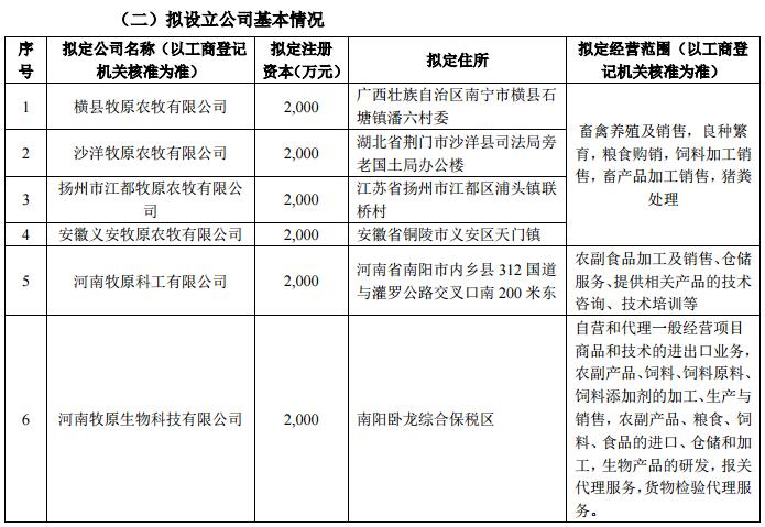 公司以自有資金出資設立橫縣牧原、沙洋牧原、江都牧原、義安牧原、牧原科工。河南牧原糧食貿易有限公司以自有資金出資設立牧原生物。