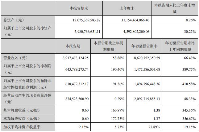 天康生物10月29日公布2020年前三季度業(yè)績(jī)報(bào)告。前三季實(shí)現(xiàn)營(yíng)業(yè)收入86.21億元,同比增長(zhǎng)66.43%;歸屬于上市公司股東的凈利潤(rùn)14.78億元,同比增長(zhǎng)389.75%;其中,第三季度營(yíng)收39.17億元,同比增加58.88%,凈利潤(rùn)6.44億元,同比增加190.4%。
