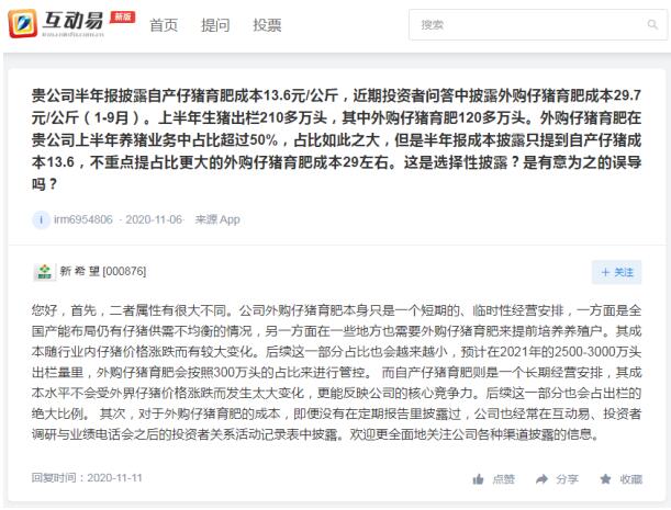 其次,對于外購仔豬育肥的成本,即便沒有在定期報告里披露過,公司也經(jīng)常在互動易、投資者調研與業(yè)績電話會之后的投資者關系活動記錄表中披露。歡迎更全面地關注公司各種渠道披露的信息。