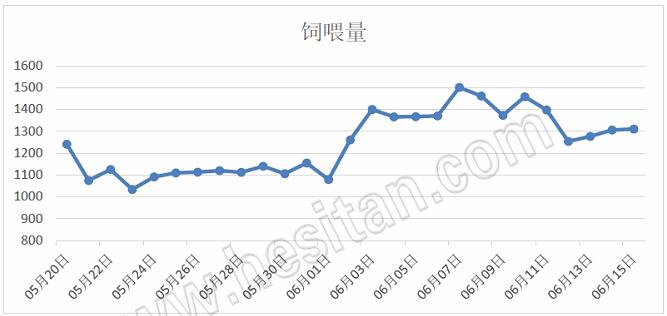 前期實驗階段結(jié)束后,開始在高產(chǎn)泌乳群全部飼喂發(fā)酵飼料,共計420頭牛,全部采用前期實驗用量,以1kg精飼料等量替換成發(fā)酵飼料,大量使用以便驗證對于奶牛消化道的影響。影響最明顯的屬產(chǎn)后牛,產(chǎn)后牛平均每天在40頭左右,牛群小方便管理觀察收集數(shù)據(jù)。以下是產(chǎn)后牛5月20日至6月15日的每日飼喂量。