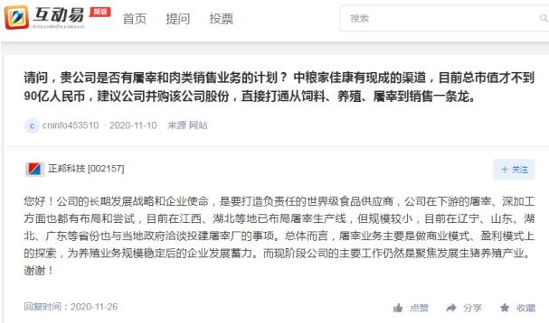 正邦科技26在回復(fù)投資者提問(wèn)時(shí)表示,公司的長(zhǎng)期發(fā)展戰(zhàn)略和企業(yè)使命,是要打造負(fù)責(zé)任的世界級(jí)食品供應(yīng)商,公司在下游的屠宰、深加工方面也都有布局和嘗試,目前在江西、湖北等地已布局屠宰生產(chǎn)線,但規(guī)模較小,目前在遼寧、山東、湖北、廣東等省份也與當(dāng)?shù)卣⒄勍督ㄍ涝讖S的事項(xiàng)。