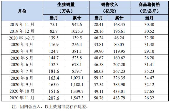 12月7日,牧原股份公布2020年11月份生豬銷售簡(jiǎn)報(bào)。2020年11月份,公司共銷售生豬207.6萬(wàn)頭,銷售收入50.78億元。其中向全資子公司牧原肉食品有限公司(簡(jiǎn)稱“牧原肉食”)銷售生豬8.7萬(wàn)頭。