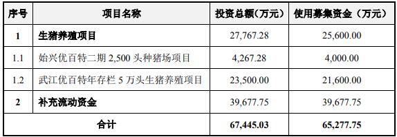 為保障募投項目的順利實施,公司擬使用募集資金25600萬元對公司控股子公司武漢天種增資,武漢天種其他股東未同比例增資,武漢天種使用募集資金25600萬元向其全資子公司始興優(yōu)百特增資;始興優(yōu)百特使用募集資金4000萬元建設(shè)始興優(yōu)百特二期2500頭種豬場項目,并使用募集資金21600萬元對武江優(yōu)百特增資,用于建設(shè)武江優(yōu)百特年存欄5萬頭生豬養(yǎng)殖項目。