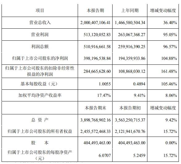 3月1日,瑞普生物發(fā)布《2020年度業(yè)績快報(bào)》。其中顯示,報(bào)告期內(nèi)公司實(shí)現(xiàn)營業(yè)收入200,040.71萬元,比上年同期增長36.40%;實(shí)現(xiàn)營業(yè)利潤51,312.01萬元,比上年同期增長95.05%;實(shí)現(xiàn)利潤總額51,091.67萬元,比上年同期增長96.57%;實(shí)現(xiàn)歸屬于上市公司股東的凈利潤39,819.65萬元,比上年同期增長104.88%;實(shí)現(xiàn)歸屬于上市公司股東的扣除非經(jīng)常性損益的凈利潤為28,466.56萬元,比上年同期增長約161.48%;基本每股收益為1.0055元,比上年同期增長105.46%。