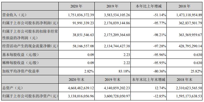 益生股份3月2日晚間發(fā)布年度業(yè)績報告稱,2020年歸屬于上市公司股東的凈利潤約為9199萬元,同比下降95.77%;營業(yè)收入約為17.51億元,同比下降51.14%;基本每股收益盈利0.09元,同比下降95.96%。