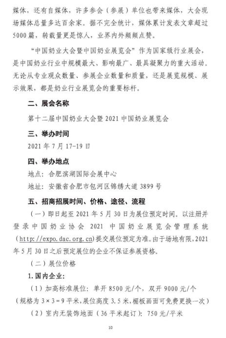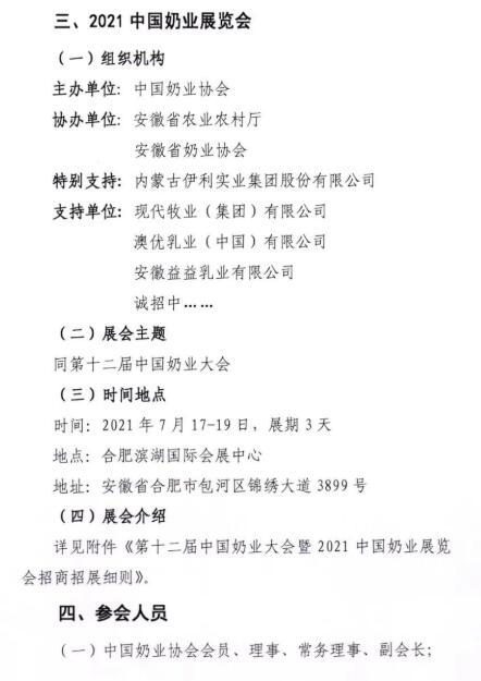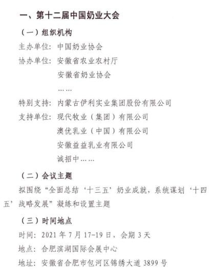 “十四五”時期是我國在全面建成小康社會、實現(xiàn)第一個百年奮斗目標之后,乘勢而上開啟全面建設社會主義現(xiàn)代化國家新征程、向第二個百年奮斗目標進軍的第一個五年。2021年是“十四五”開局之年,在“兩個一百年”歷史交匯點上,為深入貫徹落實黨和國家領(lǐng)導人有關(guān)講話指示和十九屆五中全會精神,在農(nóng)業(yè)農(nóng)村部、安徽省人民政府的鼎力支持下,中國奶業(yè)協(xié)會將圍繞“全面總結(jié)‘十三五’奶業(yè)成就,系統(tǒng)謀劃‘十四五’戰(zhàn)略發(fā)展”,擬定于2021年7月中旬在合肥市召開第十二屆中國奶業(yè)大會暨2021中國奶業(yè)展覽會和2021中國奶業(yè)20強(D20)峰會,按照國家第十四個五年規(guī)劃總體要求,貫徹新發(fā)展理念,開創(chuàng)新發(fā)展格局,促進奶業(yè)全面振興,推動奶業(yè)高質(zhì)量發(fā)展,為全面建設現(xiàn)代化奶業(yè)開好局、起好步?,F(xiàn)將有關(guān)事宜通知如下: