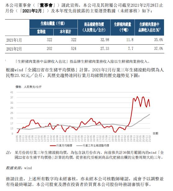 中糧家佳康3月8日公布2021年2月運營快報。公司2月份銷售生豬20.2萬頭,環(huán)比減少37.27%;商品豬銷售均價27.33元/公斤,環(huán)比下跌17.13%;生鮮豬肉銷售0.77萬噸,環(huán)比減少34.75%。