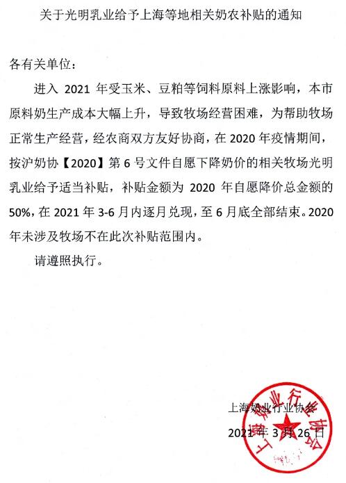 進入2021年受玉米、豆粕等飼料原料上漲影響,本市原料奶生產(chǎn)成本大幅上升,導致牧場經(jīng)營困難,為幫助牧場正常生產(chǎn)經(jīng)營,經(jīng)農(nóng)商雙方友好協(xié)商,在2020年疫情期間,按滬奶協(xié)【2020】第6號文件自愿下降奶價的相關(guān)牧場光明乳業(yè)給予適當補貼,補貼金額為2020年自愿降價總金額的50%,在2021年3-6月內(nèi)逐月兌現(xiàn),至6月底全部結(jié)束。2020年未涉及牧場不在此次補貼范圍內(nèi)。