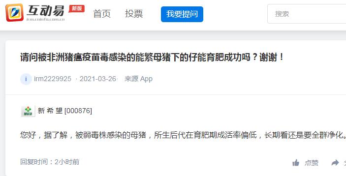 4月1日,新希望在互動(dòng)平臺(tái)上表示,被弱毒株感染的母豬,所生后代在育肥期成活率偏低,長(zhǎng)期看還是要全群凈化。
