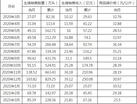 新希望4月8日公布2021年3月生豬銷售情況簡報。公司2021年3月銷售生豬85.39萬頭,環(huán)比變動22.37%,同比變動215.44%;收入為21.81億元,環(huán)比變動7.02%,同比變動111.34%;商品豬銷售均價23.50元/公斤,環(huán)比變動-20.01%,同比變動-28.27%。