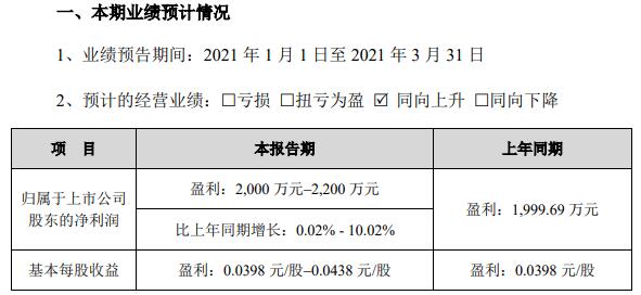 得利斯4月15日發(fā)布2021年第一季度業(yè)績預告。預計在2021年實現(xiàn)凈利潤2000-2200萬元,同比增長0.02%-10.02%。