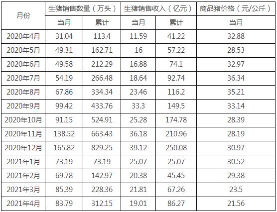 新希望六和5月8日公布2021年4月生豬銷售情況簡報。公司2021年4月銷售生豬83.79萬頭,環(huán)比變動-1.87%,同比變動169.94%;收入為19.01億元,環(huán)比變動-12.84%,同比變動64.02%;商品豬銷售均價21.56元/公斤,環(huán)比變動-8.26%,同比變動-34.43%。
