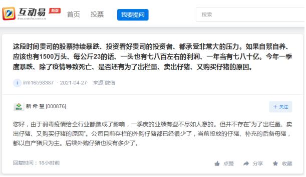 5月10日,新希望在回復投資者提問時表示,由于弱毒疫情給全行業(yè)都造成了影響,一季度的業(yè)績有些不盡如人意的。但并不存在“為了出欄量、賣出仔豬、又購買仔豬的原因”。