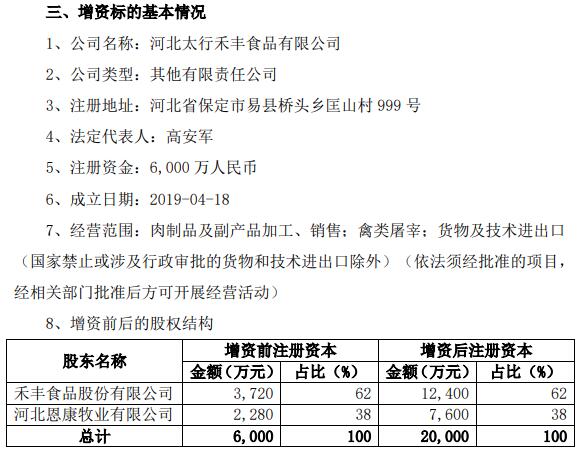 據(jù)了解,河北太行禾豐食品有限公司系禾豐與恩康牧業(yè)共同出資設(shè)立的,各股東同比例現(xiàn)金增資,本公司持股62%,增資8,680萬元;恩康牧業(yè)持股38%,增資5,320萬元。