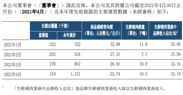 中糧家佳康5月11日發(fā)布公告,2021年4月,公司生豬出欄量31.9萬頭,本年累計生豬出欄量112.1萬頭;生鮮豬肉銷量10.5千噸,商品豬銷售均價人民幣23.74元/公斤,生鮮豬肉業(yè)務(wù)中品牌收入占比為33.1%。