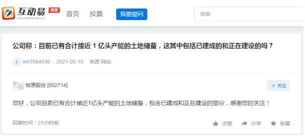 牧原股份:目前已有合計(jì)接近1億頭產(chǎn)能的土地儲(chǔ)備,包含已建和在建部分