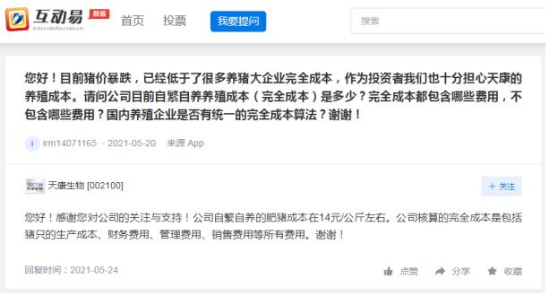天康生物近日在回復(fù)投資者提問時(shí)表示,公司自繁自養(yǎng)的肥豬成本在14元/公斤左右。公司核算的完全成本是包括豬只的生產(chǎn)成本、財(cái)務(wù)費(fèi)用、管理費(fèi)用、銷售費(fèi)用等所有費(fèi)用。