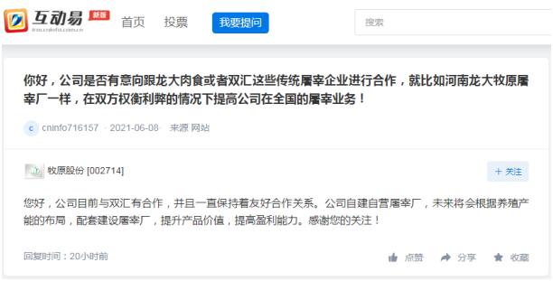 牧原:目前與雙匯有合作,并且一直保持著友好合作關(guān)系