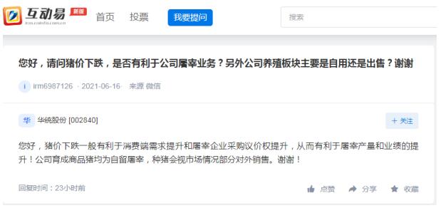 華統(tǒng)股份近日在回復(fù)投資者提問時(shí)表示,豬價(jià)下跌一般有利于消費(fèi)端需求提升和屠宰企業(yè)采購議價(jià)權(quán)提升,從而有利于屠宰產(chǎn)量和業(yè)績的提升!公司育成商品豬均為自留屠宰,種豬會(huì)視市場情況部分對外銷售。