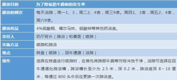 (泌乳、非泌乳)定期蹄浴,實(shí)施蹄浴制度,確保奶牛進(jìn)行有效蹄浴,蹄浴可用于治療、控制和預(yù)防蹄腐爛、趾間和皮炎。蹄浴液的深度以淹沒(méi)奶牛的蹄部為宜(9~12cm),藥浴前一定要先洗凈牛蹄,藥浴液濃度4%硫酸銅和4%福爾馬林溶液,及時(shí)更換藥浴液,將溶液的pH值控制在4左右,要求每池藥浴液只能藥浴500~800頭。環(huán)境低于13℃時(shí)福爾馬林蹄浴不起作用。如果蹄冠部出現(xiàn)被毛豎立或皮膚出現(xiàn)燒灼狀態(tài),停止使用福爾馬林蹄浴。硫酸銅需要用熱水先溶解再配比。圍產(chǎn)、干奶牛、青牛牛(10月齡以上)堅(jiān)持每周浴蹄一次,方法是使用每棟舍通道處的蹄浴槽,有專(zhuān)人負(fù)責(zé)藥浴液配比,記錄等工作。我場(chǎng)泌乳牛的蹄浴槽設(shè)在回牛通道處,每天堅(jiān)持浴蹄,上午5:30-11:00浴蹄800頭。