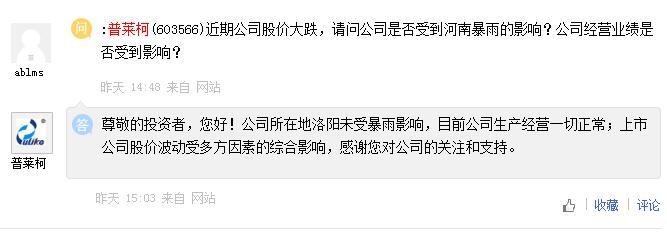 普萊柯:公司所在地洛陽(yáng)未受暴雨影響,目前公司生產(chǎn)經(jīng)營(yíng)一切正常